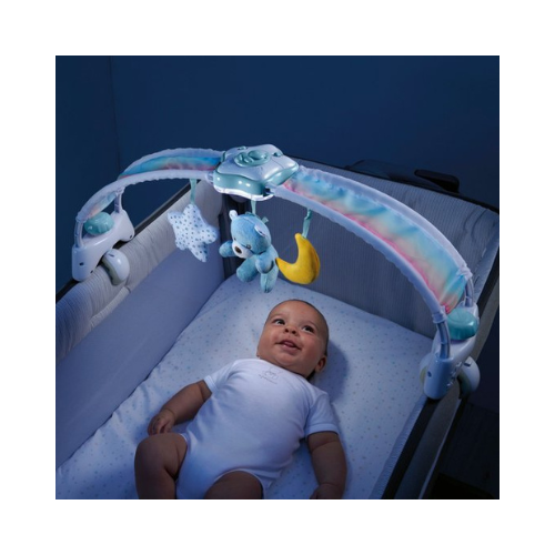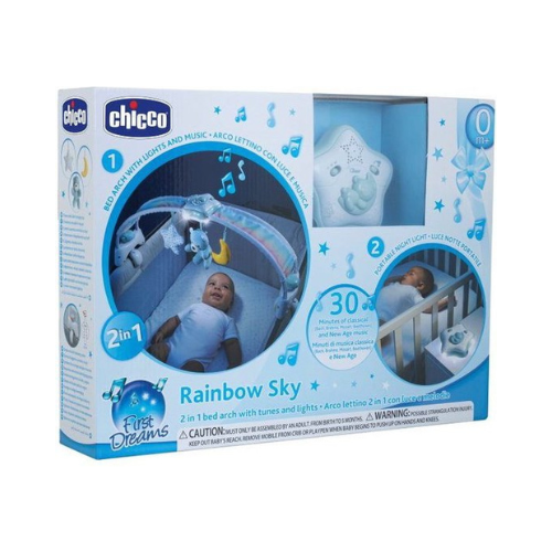 Wat zal je kindje heerlijk ontspannen en in slaap vallen met de Rainbow Sky Speelboog van Chicco! Deze 2-in-1 speelboog is zowel als bedboog en als los nachtlampje te gebruiken. Hij heeft een mooi en rustgevend regenboog design die zorgt voor een magische sfeer en 3 zachte knuffeltjes/speeltjes waar je kindje naar kan kijken en grijpen.
