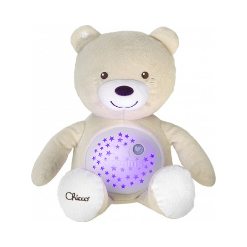 Chicco Baby Bear First Dreams. Droom heerlijk weg bij de bewegende projecties en rustgevende melodietjes van deze zachte, knuffelbare projector van Chicco. Hij speelt 30 minuten muziek in de genres klassiek (Bach/Beethoven), jazz, soft-rock, modern, new age en natuurgeluiden. Slapen was nog nooit zo leuk!